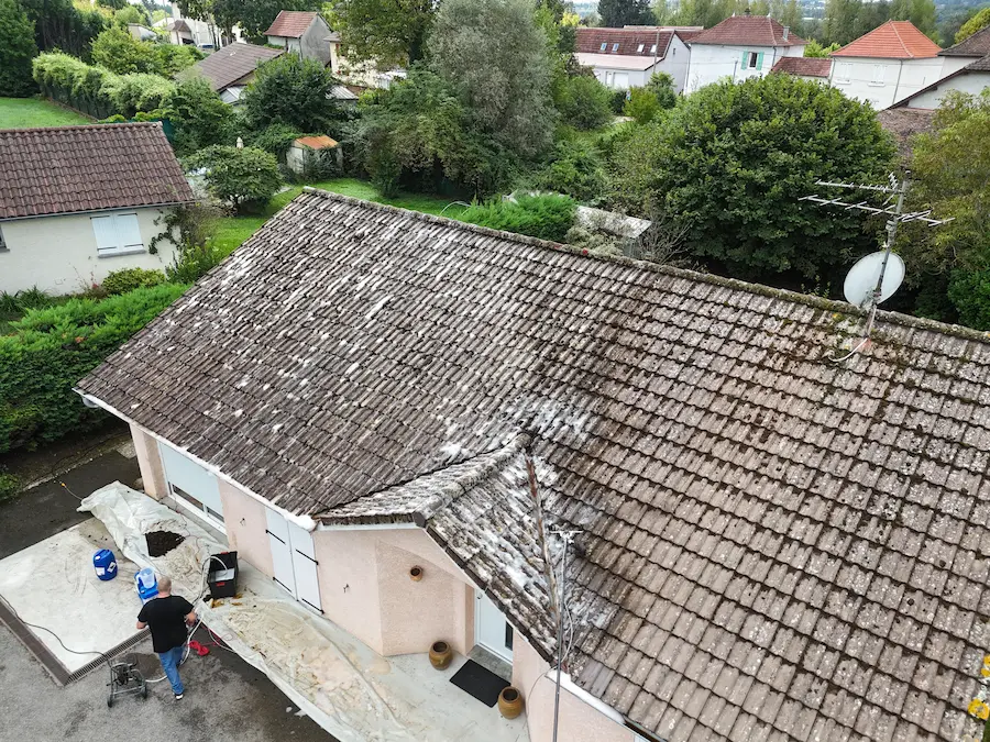 Le drone pulvérise un produit nettoyant spécifique sur votre façade : traces noires sous les gouttières, taches de pollution, zones envahies de mousses ou de lichens. Ce traitement préalable décolle les salissures en profondeur et facilite le nettoyage final.