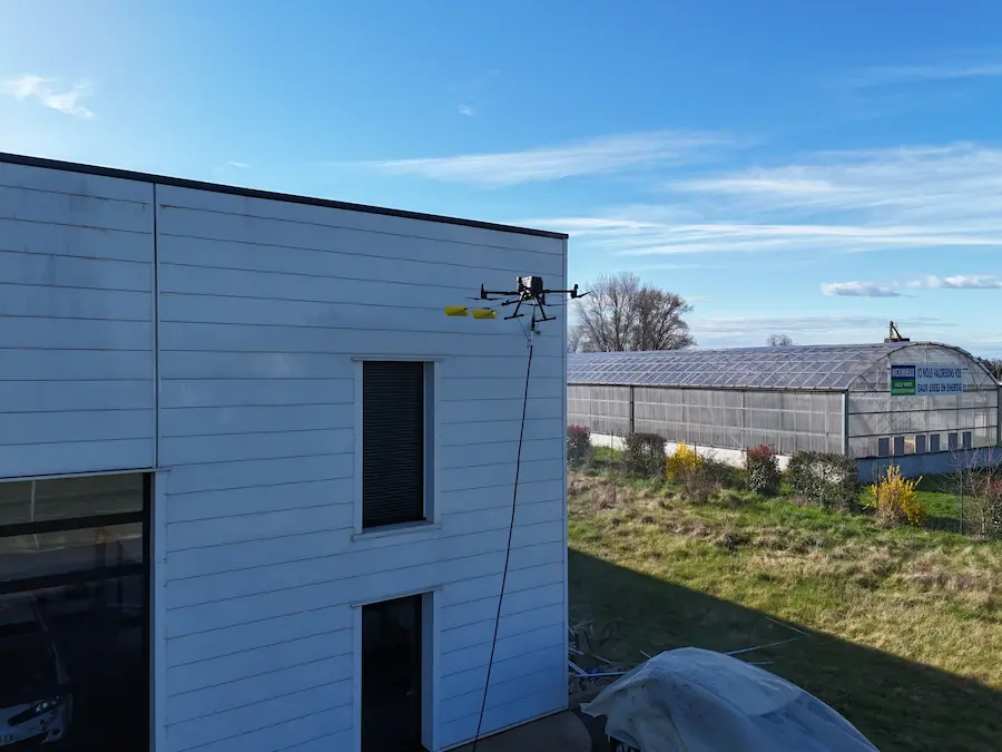 Notre technologie atteint facilement les zones inaccessibles : pignons, dessous de toiture, encadrements de fenêtres à l'étage, recoins autour de la cheminée. Le drone nettoie uniformément toute votre façade, même sur une maison à étages ou avec une architecture complexe, pour un rendu homogène.